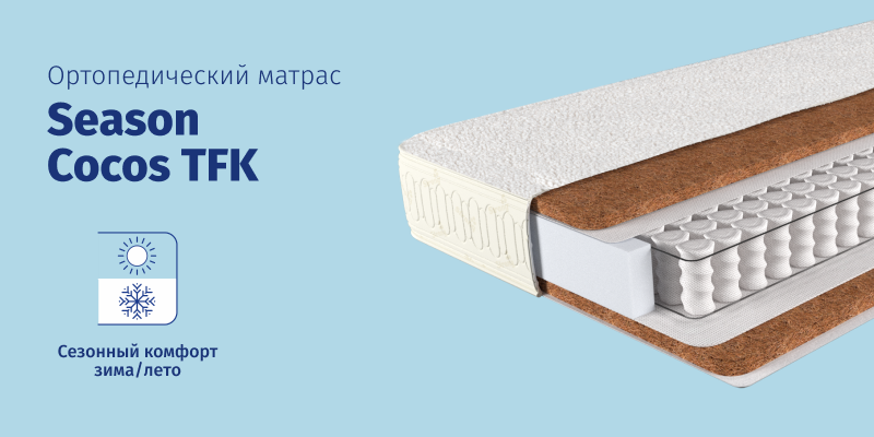 • Season. Ортопедические матрасы по доступной цене с двусторонней жесткостью выполнены на основе пружинных блоков Bonnel и Pocket Spring. Они характеризуются сезонным покрытием «лето-зима», которое обеспечит вам комфортный отдых во время изменения температур.